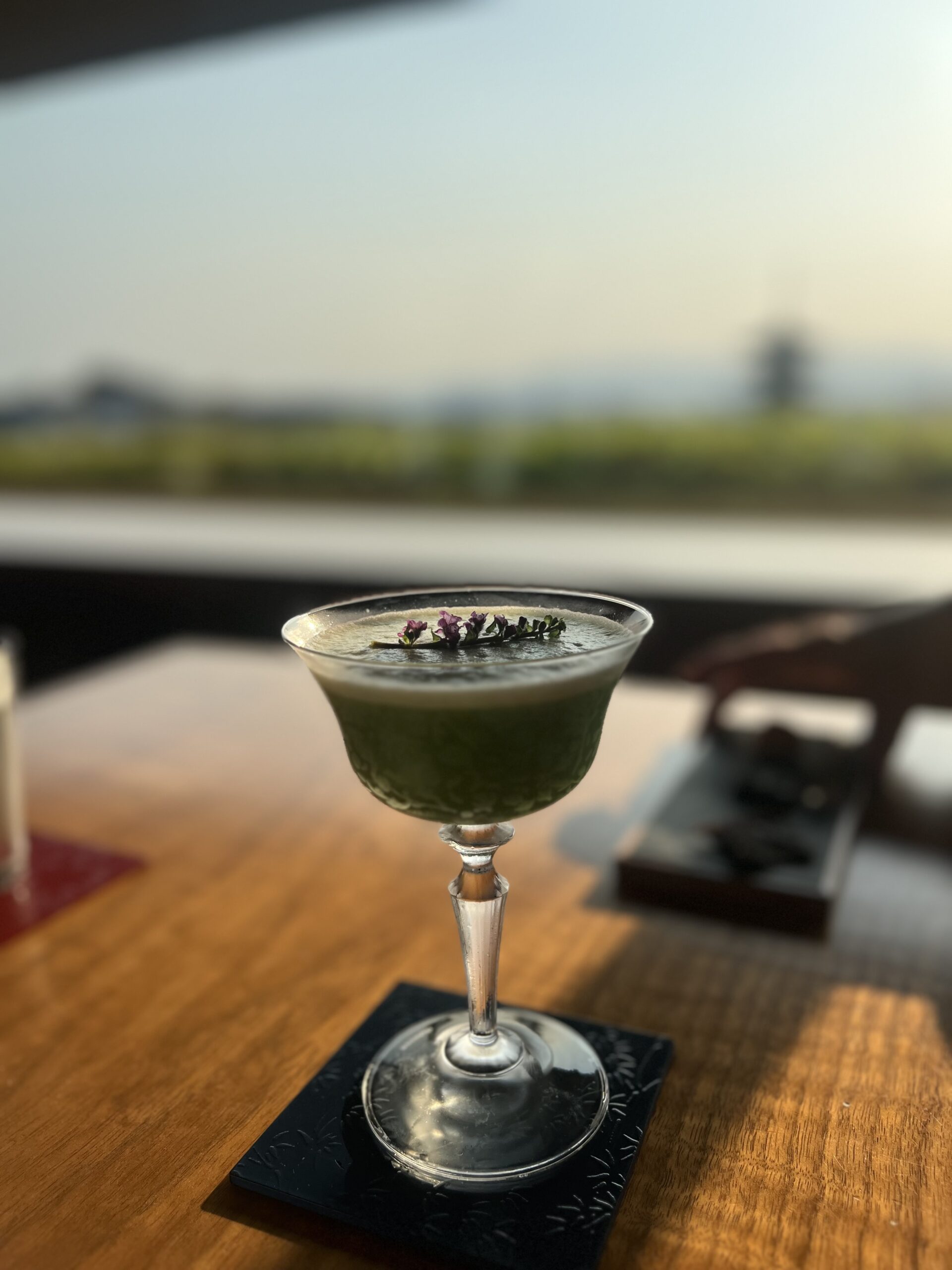 夕闇が迫り、八坂の塔が借景として浮かび上がるバー『琥珀』。そこで頂いたのは、中村トップバーテンダーによる弊社の抹茶を使ったオリジナルカクテルです。