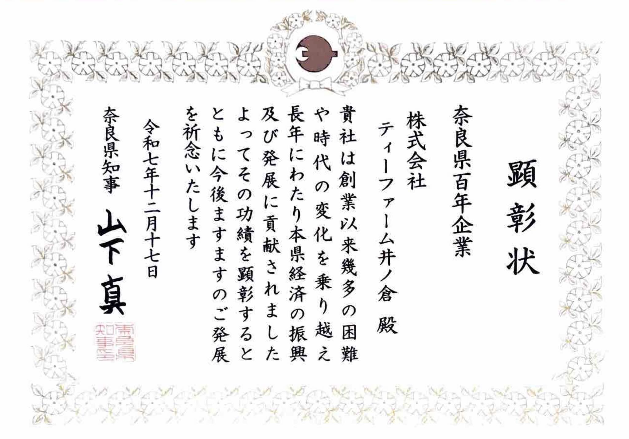 この顕彰は、奈良県内において100年以上の長きにわたり、地域経済の発展に寄与し、企業活動を続けてきた企業を称えるものです。今年度は県内から28社が選出され、大変光栄なことに弊社もその一社として、山下真知事より顕彰状を授与いただきました。