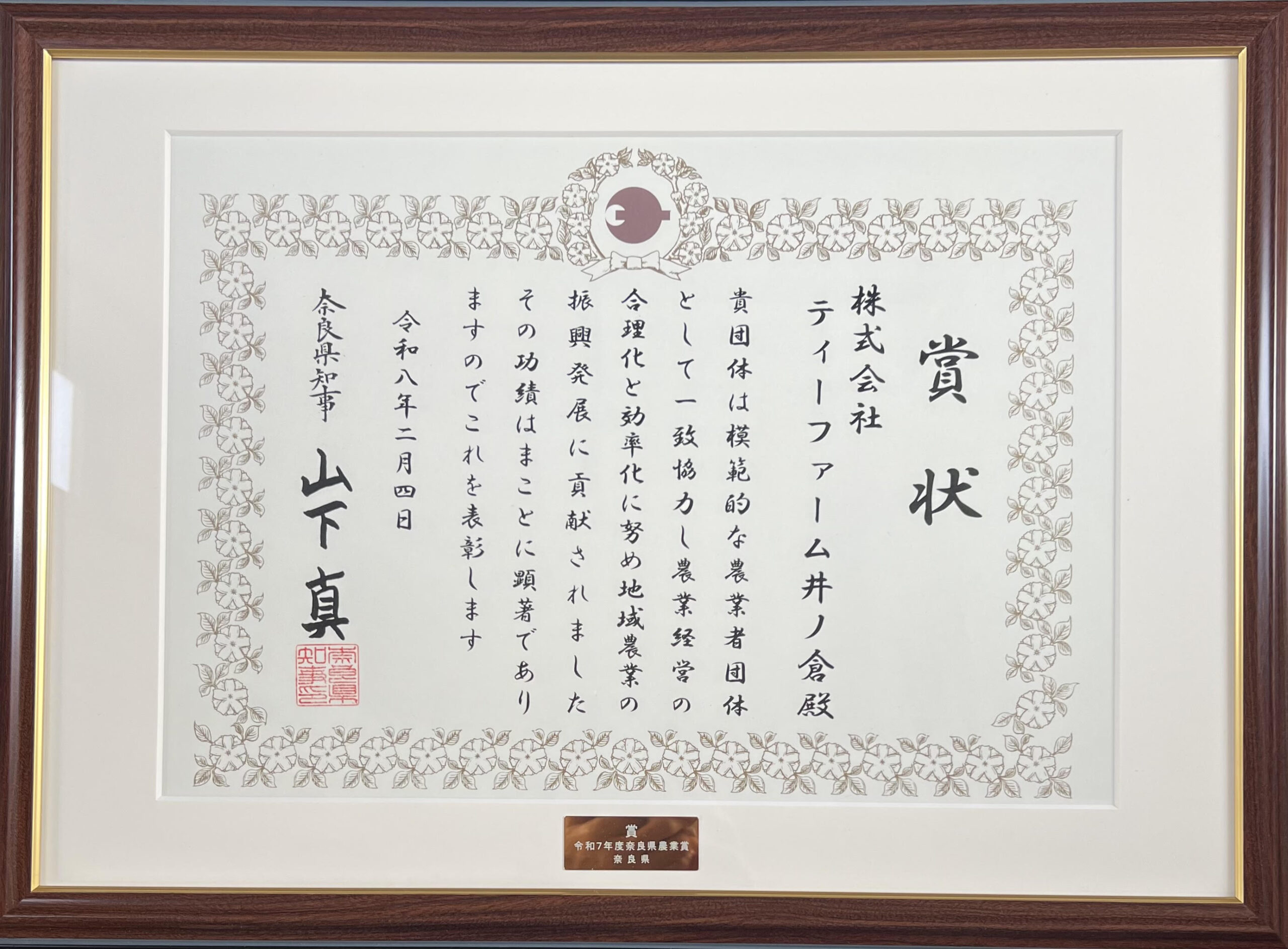 この度、株式会社ティーファーム井ノ倉は、栄えある**「奈良県農業賞」**を受賞いたしました。